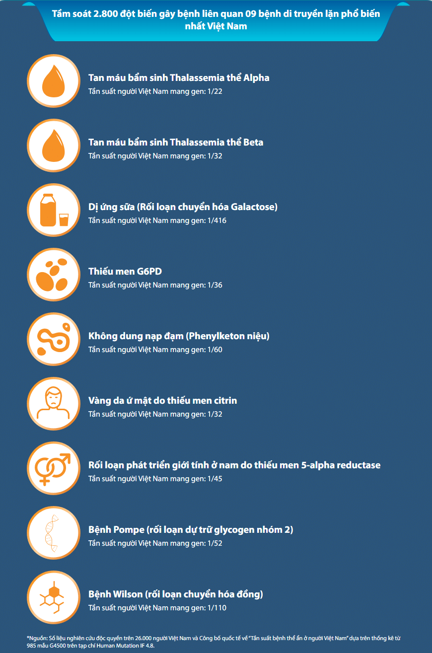 Hiện nay có rất nhiều bệnh di truyền bất thường phổ biến. Trong đó, người châu Á có khả năng cao mang gen lặn của các bệnh di truyền phổ biến như: Thalassemia (bệnh tan máu bẩm sinh), thiếu hụt men G6PD, rối loạn chuyển hóa đường galactose và điếc bẩm sinh,…