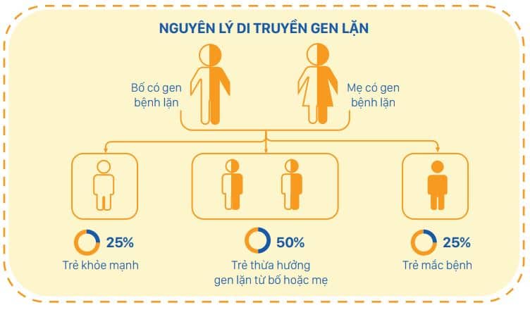 Có nhiều trường hợp cha mẹ khỏe mạnh nhưng bản thân mang các gen đột biến trong cơ thể ở trạng thái lặn, khi kết hôn sẽ có 25% con sinh ra mắc bệnh di truyền. Đặc biệt, tỷ lệ 25% mắc bệnh sẽ lặp lại với các cặp vợ chồng cùng mang một gen bệnh lặn ở mỗi lần mang thai.
